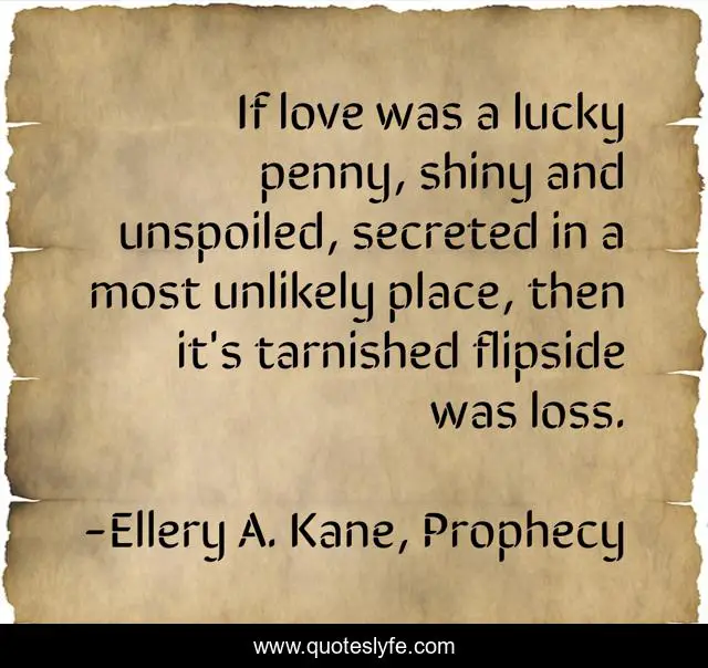 This page presents the quote "If love was a lucky penny, shiny and unspoiled, secreted in a most unlikely place, then it's tarnished flipside was loss.". Author of this quote is Ellery A. Kane, Prophecy. This quote is about loss, love, affection,.