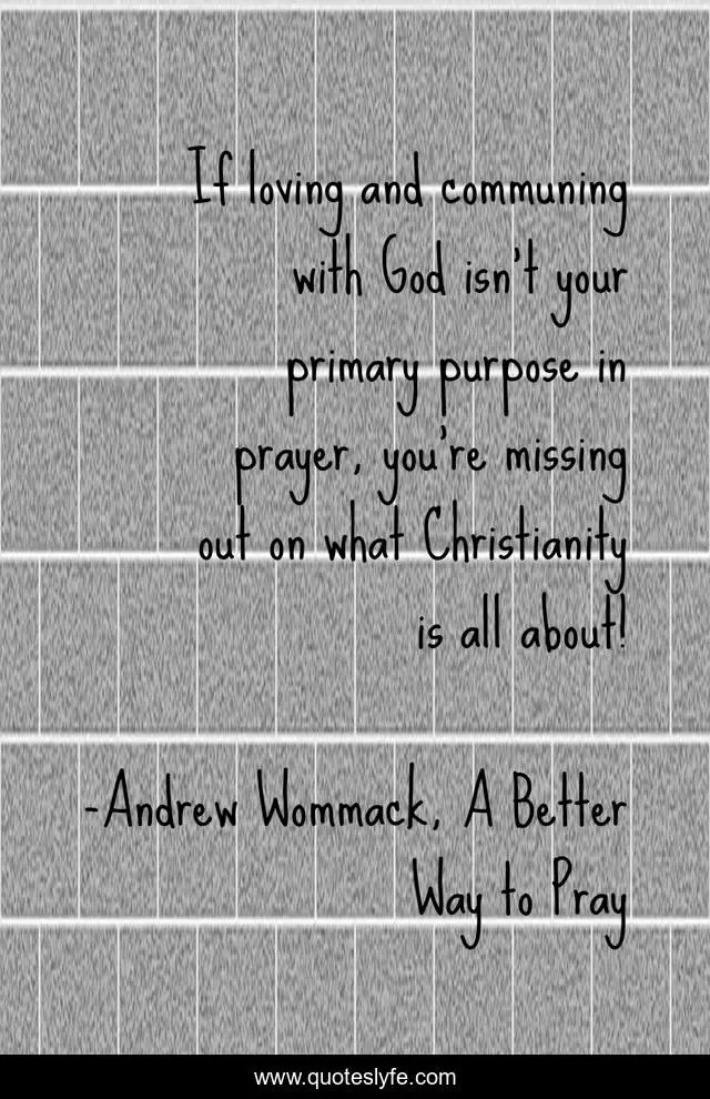 This page presents the quote "If loving and communing with God isn’t your primary purpose in prayer, you’re missing out on what Christianity is all about!". Author of this quote is Andrew Wommack, A Better Way to Pray. This quote is about god, christianity, communion, purpose, prayer,.