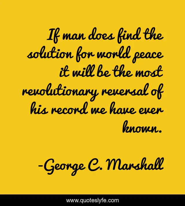 This page presents the quote "If man does find the solution for world peace it will be the most revolutionary reversal of his record we have ever known.". Author of this quote is George C. Marshall. This quote is about world, solution, man,.