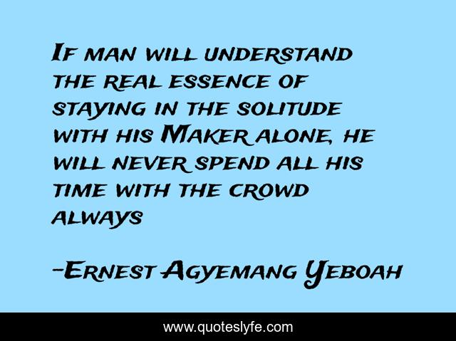 This page presents the quote "If man will understand the real essence of staying in the solitude with his Maker alone, he will never spend all his time with the crowd always". Author of this quote is Ernest Agyemang Yeboah. This quote is about time-for-god, understanding-worship, alone-in-his-presence, a-different-life, solitude, christianity, solitude-as-a-choice, a-dedicated-life, life-and-living,.