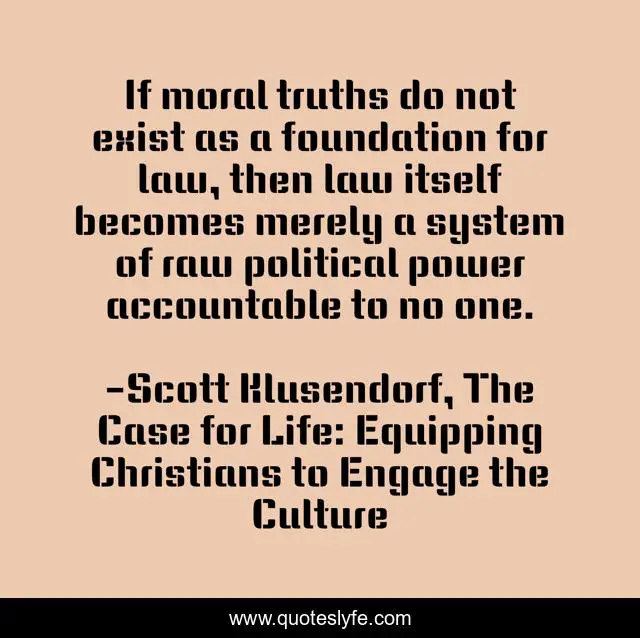 This page presents the quote "If moral truths do not exist as a foundation for law, then law itself becomes merely a system of raw political power accountable to no one.". Author of this quote is Scott Klusendorf, The Case for Life: Equipping Christians to Engage the Culture. .