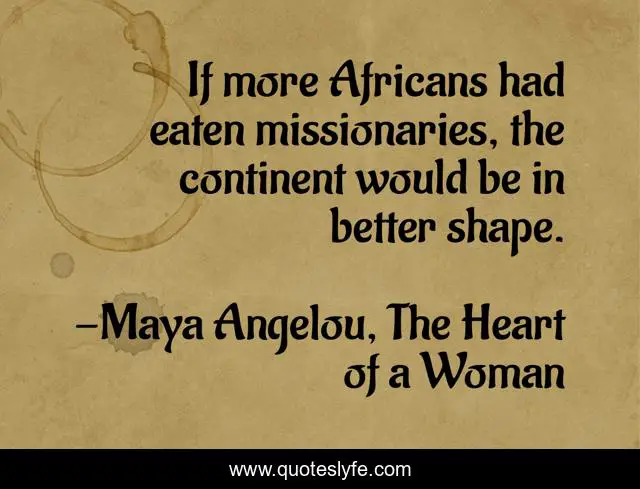 This page presents the quote "If more Africans had eaten missionaries, the continent would be in better shape.". Author of this quote is Maya Angelou, The Heart of a Woman. This quote is about africa, humor,.