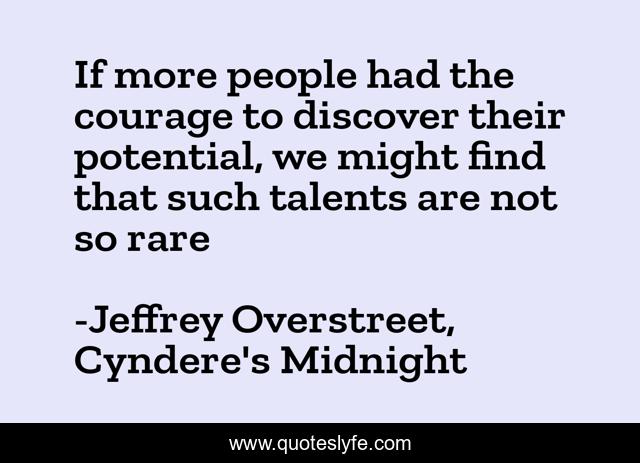 This page presents the quote "If more people had the courage to discover their potential, we might find that such talents are not so rare". Author of this quote is Jeffrey Overstreet, Cyndere's Midnight. This quote is about enthusiasm, talent, inspirational, truth,.