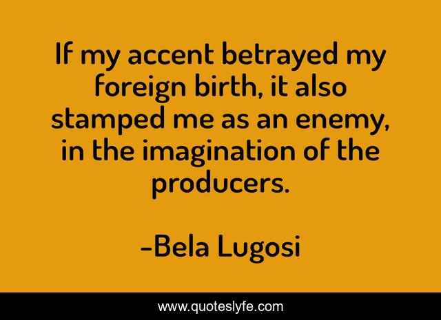 This page presents the quote "If my accent betrayed my foreign birth, it also stamped me as an enemy, in the imagination of the producers.". Author of this quote is Bela Lugosi. This quote is about me, enemy, birth,.