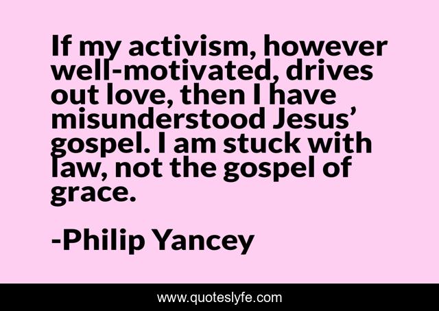 This page presents the quote "If my activism, however well-motivated, drives out love, then I have misunderstood Jesus’ gospel. I am stuck with law, not the gospel of grace.". Author of this quote is Philip Yancey. .