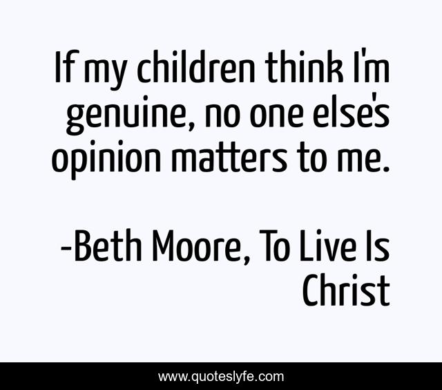 This page presents the quote "If my children think I'm genuine, no one else's opinion matters to me.". Author of this quote is Beth Moore, To Live Is Christ. This quote is about parenthood, authenticity, sincerity, family, testimony,.