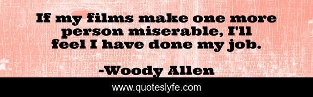 This page presents the quote "If my films make one more person miserable, I'll feel I have done my job.". Author of this quote is Woody Allen. This quote is about person, job, done,.