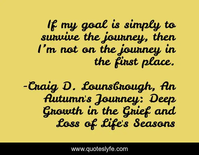 This page presents the quote "If my goal is simply to survive the journey, then I’m not on the journey in the first place.". Author of this quote is Craig D. Lounsbrough, An Autumn's Journey: Deep Growth in the Grief and Loss of Life's Seasons. This quote is about goal, survival, destination, journey, safety, survive, security, self-preservation,.