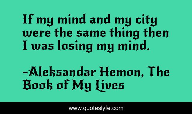 This page presents the quote "If my mind and my city were the same thing then I was losing my mind.". Author of this quote is Aleksandar Hemon, The Book of My Lives. This quote is about city, mind,.