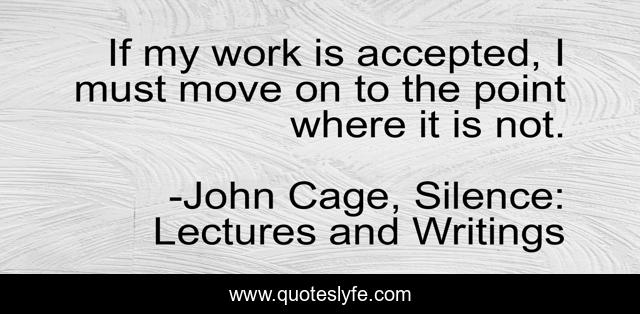 This page presents the quote "If my work is accepted, I must move on to the point where it is not.". Author of this quote is John Cage, Silence: Lectures and Writings. This quote is about modernism, acceptance, avant-garde, novelty, populism,.