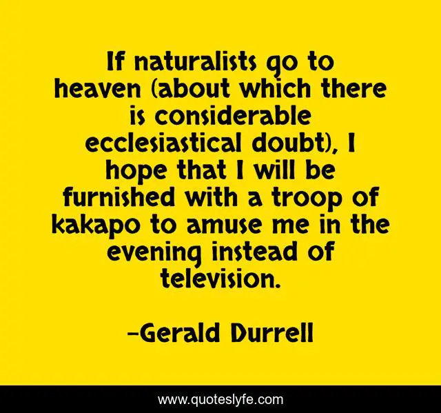 This page presents the quote "If naturalists go to heaven (about which there is considerable ecclesiastical doubt), I hope that I will be furnished with a troop of kakapo to amuse me in the evening instead of television.". Author of this quote is Gerald Durrell. This quote is about television, heaven, nature,.