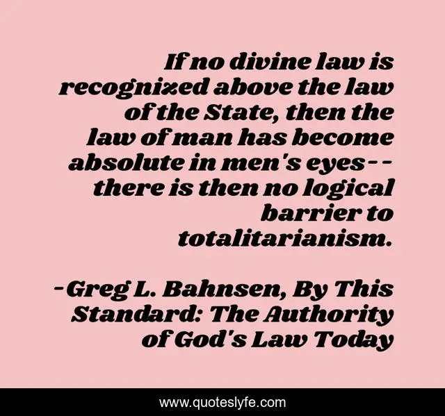 This page presents the quote "If no divine law is recognized above the law of the State, then the law of man has become absolute in men's eyes--there is then no logical barrier to totalitarianism.". Author of this quote is Greg L. Bahnsen, By This Standard: The Authority of God's Law Today. This quote is about totalitarianism, theonomy, law, government,.