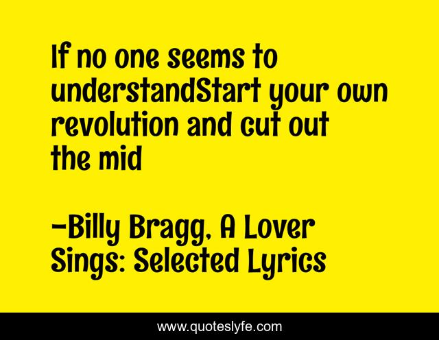 This page presents the quote "If no one seems to understandStart your own revolution and cut out the mid". Author of this quote is Billy Bragg, A Lover Sings: Selected Lyrics. .