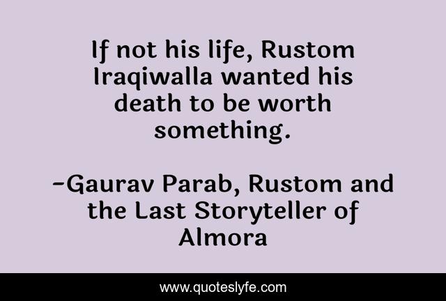 This page presents the quote "If not his life, Rustom Iraqiwalla wanted his death to be worth something.". Author of this quote is Gaurav Parab, Rustom and the Last Storyteller of Almora. This quote is about philosophy-of-life, death-and-dying,.