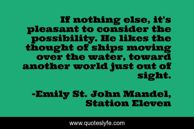 This page presents the quote "If nothing else, it's pleasant to consider the possibility. He likes the thought of ships moving over the water, toward another world just out of sight.". Author of this quote is Emily St. John Mandel, Station Eleven. This quote is about pleasant, dystopia, ships, possibilities, world, station-eleven,.