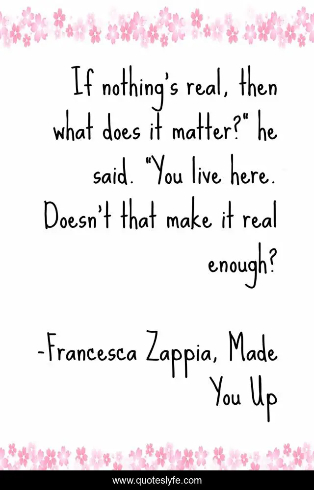 "Francesca Zappia, Made You Up Quotes." Quoteslyfe.com, 2025. Sat. 06 Dec. 2025. <https://www.quoteslyfe.com/quote/If-nothing-s-real-then-what-does-93396>.