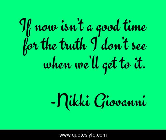 This page presents the quote "If now isn't a good time for the truth I don't see when we'll get to it.". Author of this quote is Nikki Giovanni. This quote is about see, good, time,.