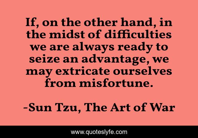 This page presents the quote "If, on the other hand, in the midst of difficulties we are always ready to seize an advantage, we may extricate ourselves from misfortune.". Author of this quote is Sun Tzu, The Art of War. This quote is about fortune, advantage, seize, strategy, difficulty, war,.