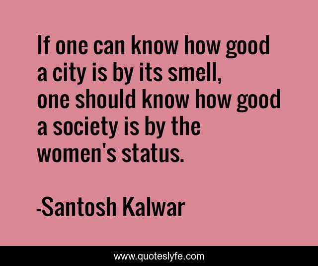 This page presents the quote "If one can know how good a city is by its smell, one should know how good a society is by the women's status.". Author of this quote is Santosh Kalwar. This quote is about enthusiasm, feminism, inspirational, women,.