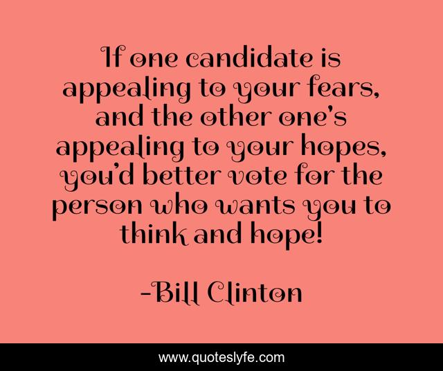 This page presents the quote "If one candidate is appealing to your fears, and the other one's appealing to your hopes, you’d better vote for the person who wants you to think and hope!". Author of this quote is Bill Clinton. .