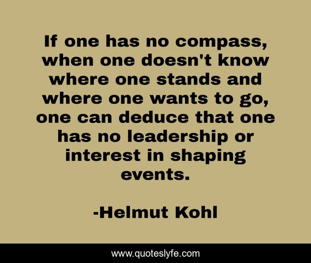 This page presents the quote "If one has no compass, when one doesn't know where one stands and where one wants to go, one can deduce that one has no leadership or interest in shaping events.". Author of this quote is Helmut Kohl. This quote is about events, compass,.