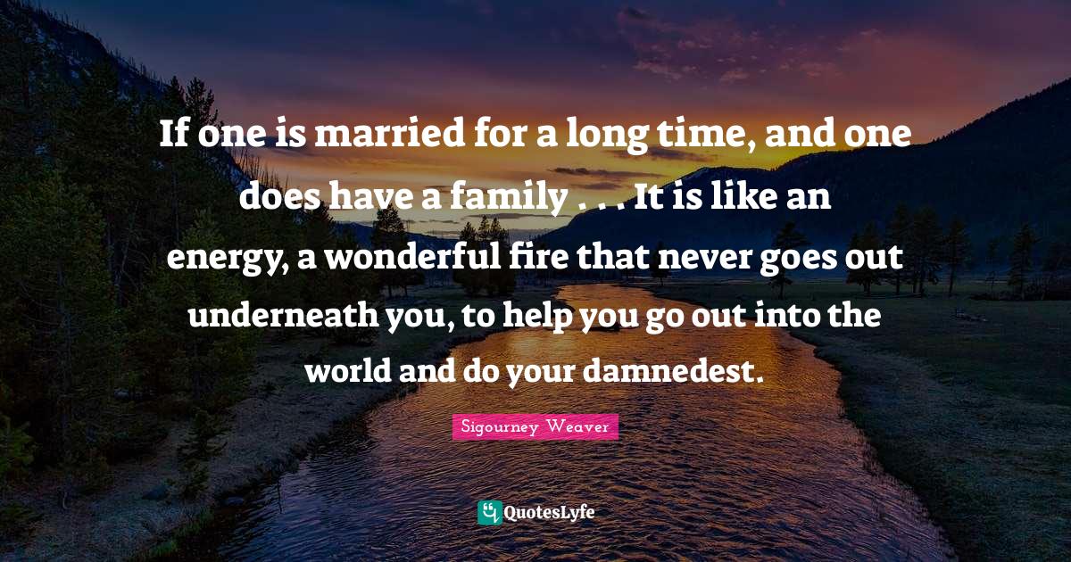 This page presents the quote "If one is married for a long time, and one does have a family . . . It is like an energy, a wonderful fire that never goes out underneath you, to help you go out into the world and do your damnedest.". Author of this quote is Sigourney Weaver. This quote is about long time, fire, family, long, wonderful, married, energy, world,.