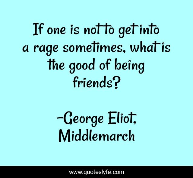 This page presents the quote "If one is not to get into a rage sometimes, what is the good of being friends?". Author of this quote is George Eliot, Middlemarch. This quote is about friends, rage,.