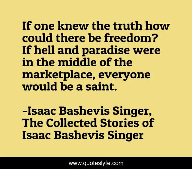 This page presents the quote "If one knew the truth how could there be freedom? If hell and paradise were in the middle of the marketplace, everyone would be a saint.". Author of this quote is Isaac Bashevis Singer, The Collected Stories of Isaac Bashevis Singer. This quote is about religion, philosophy,.