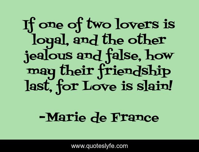 This page presents the quote "If one of two lovers is loyal, and the other jealous and false, how may their friendship last, for Love is slain!". Author of this quote is Marie de France. This quote is about love, friendship, affection, love is,.