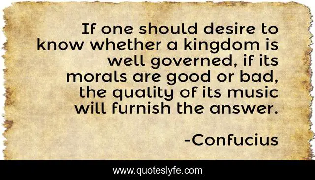 This page presents the quote "If one should desire to know whether a kingdom is well governed, if its morals are good or bad, the quality of its music will furnish the answer.". Author of this quote is Confucius. This quote is about kingdom, music, morals,.