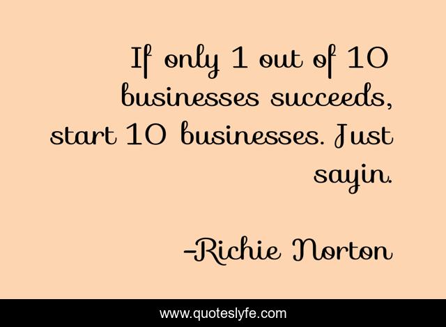 This page presents the quote "If only 1 out of 10 businesses succeeds, start 10 businesses. Just sayin.". Author of this quote is Richie Norton. This quote is about confidence, self-mastery, mindful, marketing, work, success, self-help, entrepreneur, innovation,.