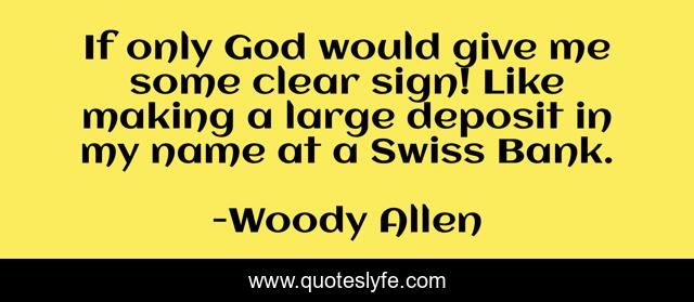 This page presents the quote "If only God would give me some clear sign! Like making a large deposit in my name at a Swiss Bank.". Author of this quote is Woody Allen. .