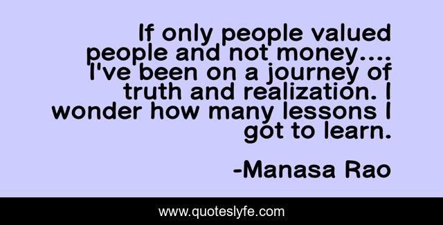 This page presents the quote "If only people valued people and not money…. I've been on a journey of truth and realization. I wonder how many lessons I got to learn.". Author of this quote is Manasa Rao. This quote is about money, life-lessons, truth, realization,.