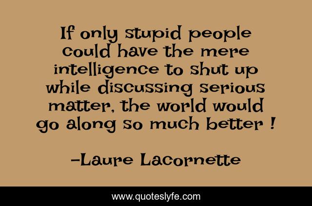 This page presents the quote "If only stupid people could have the mere intelligence to shut up while discussing serious matter, the world would go along so much better !". Author of this quote is Laure Lacornette. This quote is about intelligence, citation, shut-up, stupid, quote, about-french-elections-2017,.