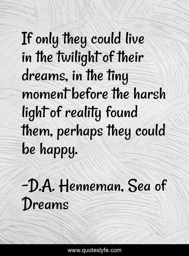 This page presents the quote "If only they could live in the twilight of their dreams, in the tiny moment before the harsh light of reality found them, perhaps they could be happy.". Author of this quote is D.A. Henneman, Sea of Dreams. This quote is about fantasy-romance, elements, love, elements-of-powers, magick, water, romance, dreams, romance-novels,.