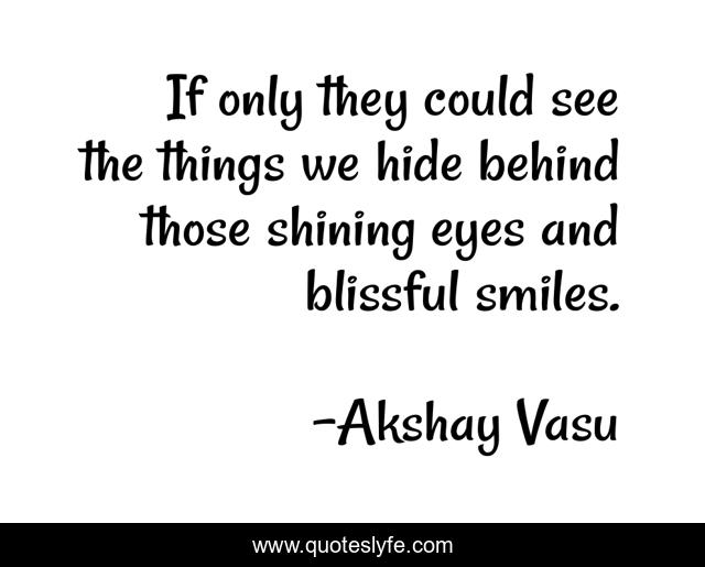 This page presents the quote "If only they could see the things we hide behind those shining eyes and blissful smiles.". Author of this quote is Akshay Vasu. This quote is about shine, eyes, hide, things, behind, bliss, smile, world, happiness,.