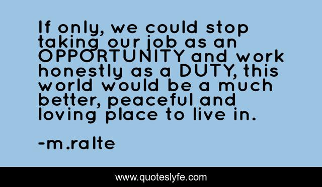 This page presents the quote "If only, we could stop taking our job as an OPPORTUNITY and work honestly as a DUTY, this world would be a much better, peaceful and loving place to live in.". Author of this quote is m.ralte. .