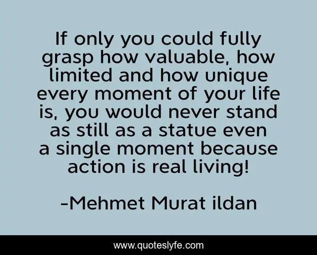 This page presents the quote "If only you could fully grasp how valuable, how limited and how unique every moment of your life is, you would never stand as still as a statue even a single moment because action is real living!". Author of this quote is Mehmet Murat ildan. This quote is about limited, mehmet-murat-ildan, moments, turkish-playwrights, valuable, turkish-wisdom-words, moments-of-life, ildan-words, turkish,.
