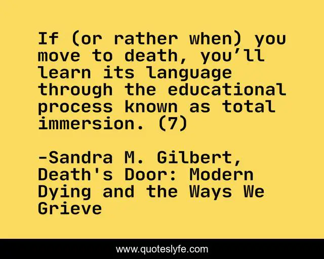 This page presents the quote "If (or rather when) you move to death, you’ll learn its language through the educational process known as total immersion. (7)". Author of this quote is Sandra M. Gilbert, Death's Door: Modern Dying and the Ways We Grieve. This quote is about death, death-and-dying, dying,.