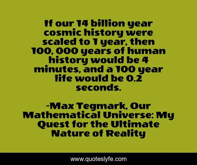 This page presents the quote "If our 14 billion year cosmic history were scaled to 1 year, then 100, 000 years of human history would be 4 minutes, and a 100 year life would be 0.2 seconds.". Author of this quote is Max Tegmark, Our Mathematical Universe: My Quest for the Ultimate Nature of Reality. This quote is about science, mathematics, physics, inspirational, enthusiasm,.