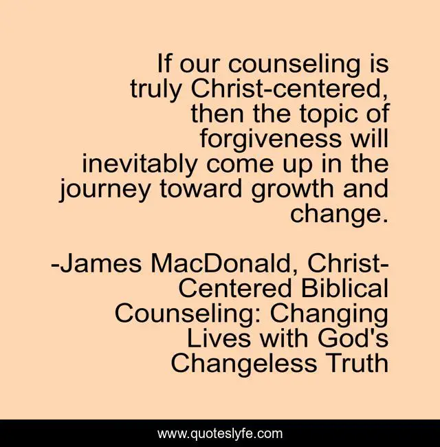 This page presents the quote "If our counseling is truly Christ-centered, then the topic of forgiveness will inevitably come up in the journey toward growth and change.". Author of this quote is James MacDonald, Christ-Centered Biblical Counseling: Changing Lives with God's Changeless Truth. This quote is about graciousness, discipleship,.