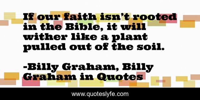 This page presents the quote "If our faith isn’t rooted in the Bible, it will wither like a plant pulled out of the soil.". Author of this quote is Billy Graham, Billy Graham in Quotes. This quote is about faith, billy-graham,.