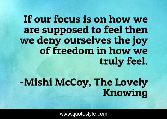 This page presents the quote "If our focus is on how we are supposed to feel then we deny ourselves the joy of freedom in how we truly feel.". Author of this quote is Mishi McCoy, The Lovely Knowing. This quote is about feelings-and-emotions, joy, mishi-mccoy, authenticity, focus, freedom, self-acceptance, be-real,.
