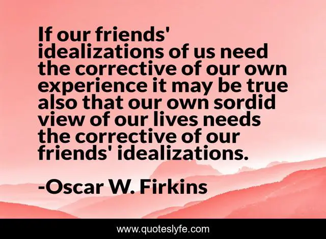 This page presents the quote "If our friends' idealizations of us need the corrective of our own experience it may be true also that our own sordid view of our lives needs the corrective of our friends' idealizations.". Author of this quote is Oscar W. Firkins. .