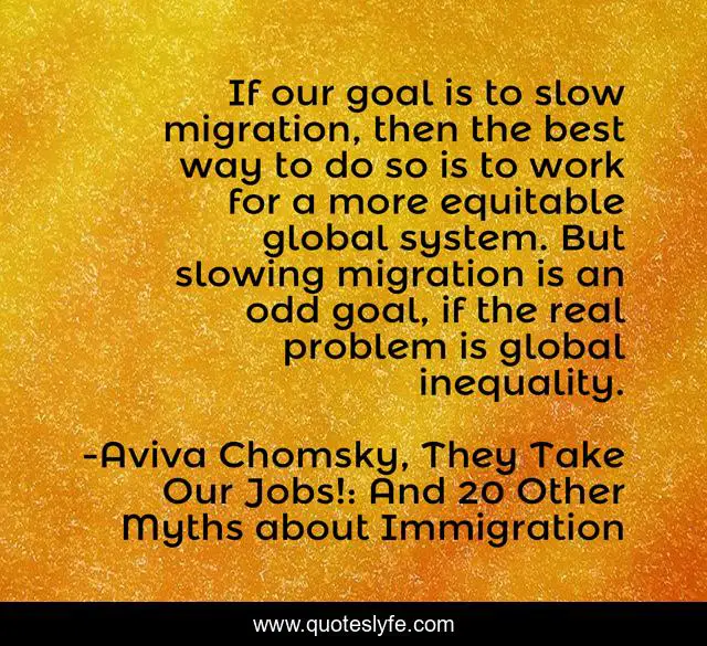 This page presents the quote "If our goal is to slow migration, then the best way to do so is to work for a more equitable global system. But slowing migration is an odd goal, if the real problem is global inequality.". Author of this quote is Aviva Chomsky, They Take Our Jobs!: And 20 Other Myths about Immigration. This quote is about justice, inequality, immigration, migration,.