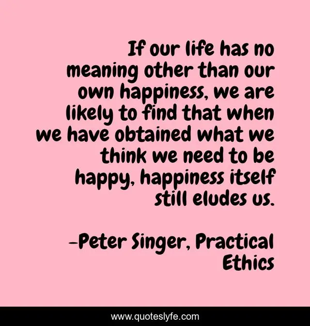 This page presents the quote "If our life has no meaning other than our own happiness, we are likely to find that when we have obtained what we think we need to be happy, happiness itself still eludes us.". Author of this quote is Peter Singer, Practical Ethics. This quote is about ethics, fulfillment, happiness,.