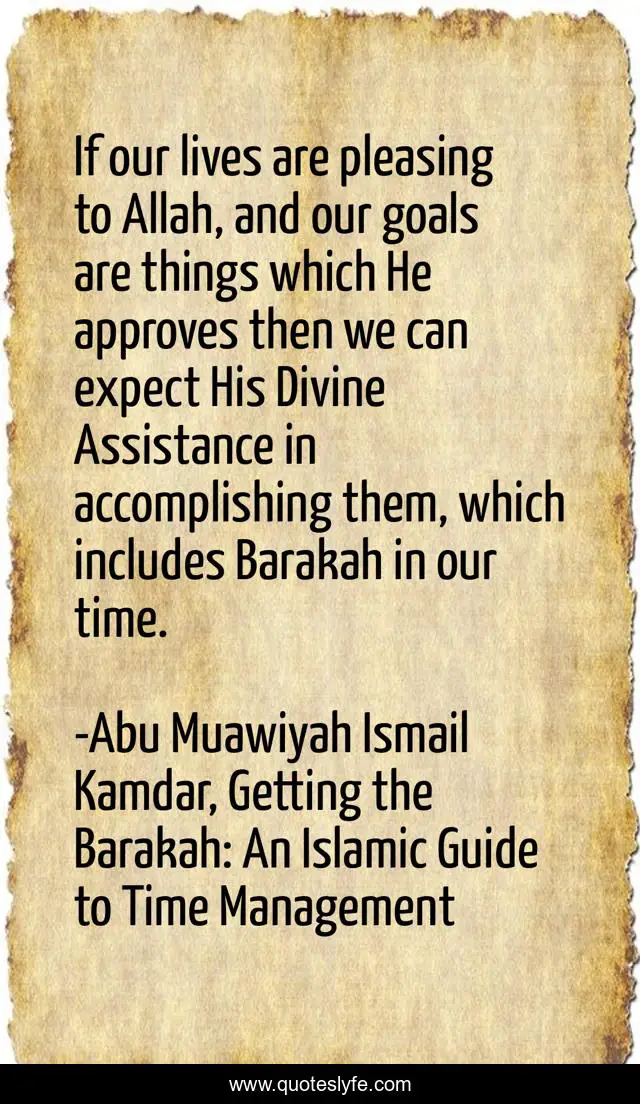 "Abu Muawiyah Ismail Kamdar, Getting the Barakah: An Islamic Guide to Time Management Quotes." Quoteslyfe.com, 2025. Mon. 08 Dec. 2025. <https://www.quoteslyfe.com/quote/If-our-lives-are-pleasing-to-Allah-141034>.