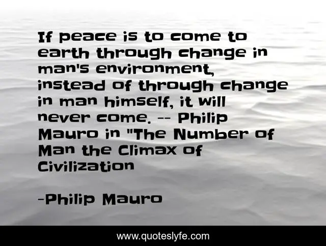 This page presents the quote "If peace is to come to earth through change in man's environment, instead of through change in man himself, it will never come. -- Philip Mauro in "The Number of Man the Climax of Civilization". Author of this quote is Philip Mauro. This quote is about peace, humanism, change,.