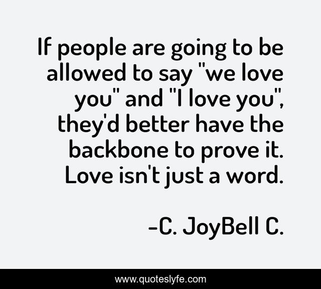 This page presents the quote "If people are going to be allowed to say "we love you" and "I love you", they'd better have the backbone to prove it. Love isn't just a word.". Author of this quote is C. JoyBell C.. This quote is about love, inspirational-love, inspirational, enthusiasm, real-love, affection,.