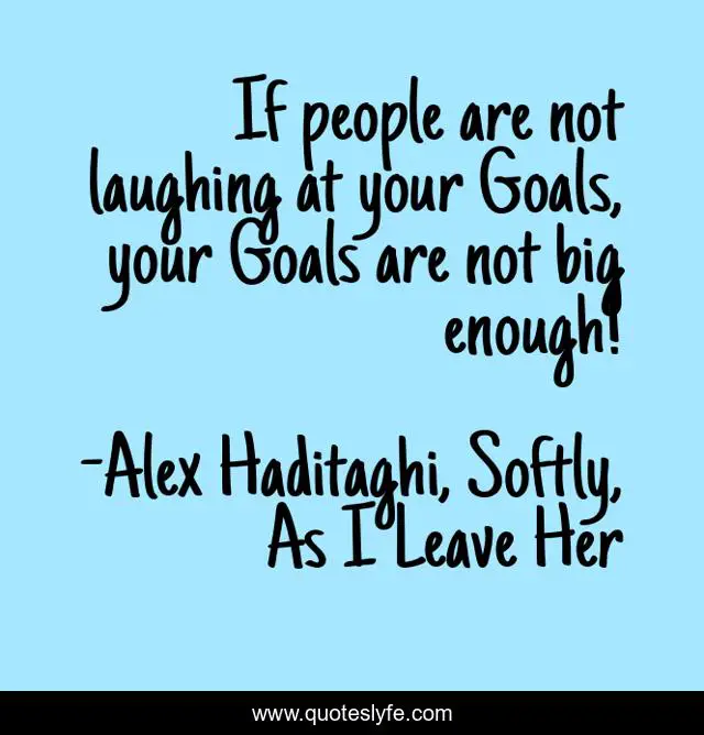 This page presents the quote "If people are not laughing at your Goals, your Goals are not big enough!". Author of this quote is Alex Haditaghi, Softly, As I Leave Her. This quote is about life, dream-big, goals-in-life, goals, inspirational, life-philosophy, enthusiasm, life-lessons, dreams,.